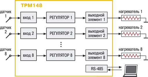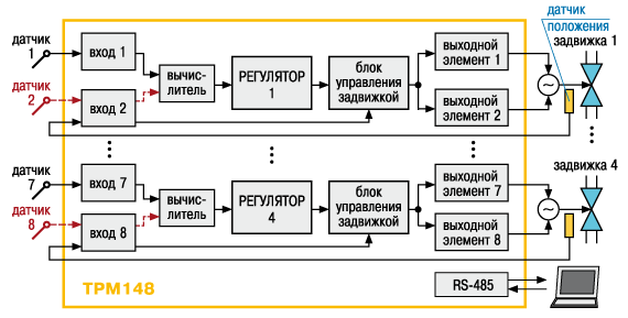 8 каналов регулирования физических величин, измеряемых датчиками. Количество каналов регулирования может быть уменьшено. Генерируется ШИМ-сигнал на дискретных выходных элементах или ток/напряжение на аналоговых выходных элементах.