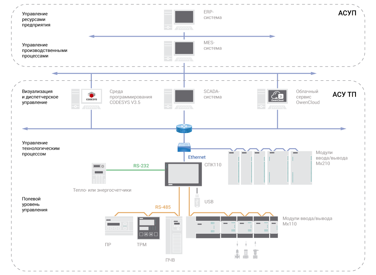 Поддержка протоколов обмена Modbus (RTU, ASCII, TCP), ОВЕН, OPC UA (Server), MQTT (Client), SNMP (Manager/Agent), протоколов тепло/электросчетчиков, возможность реализации нестандартных протоколов.