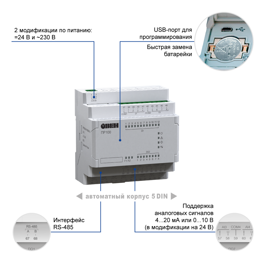 ПР100 – компактное программируемое реле для локальных систем автоматизации. Предназначено для управления освещением, насосными группами, вентиляторами, подъемниками, станками, для задач релейной защиты, АВР и т.д. Прибор изготавливается в автоматном корпусе 5 DIN. Имеет на борту аналоговые и дискретные входы, а также дискретные выходы. Для управления устройствами по сети или передачи данных на верхний уровень в приборе предусмотрен интерфейс RS-485. Написание алгоритма осуществляется пользователем на языке FBD с помощью бесплатной среды программирования Owen Logic. Загрузка алгоритма производится с помощью кабеля microUSB