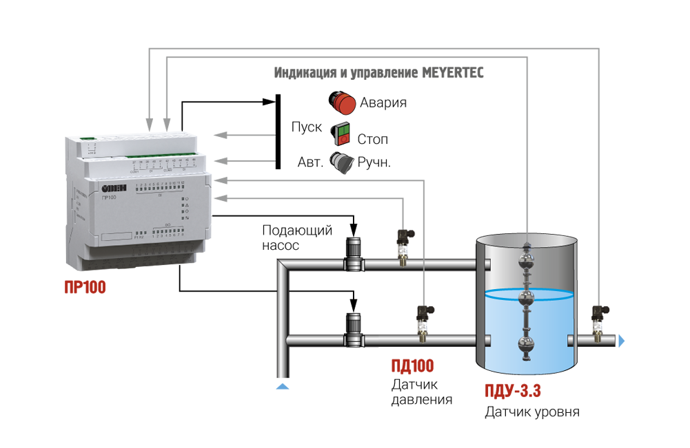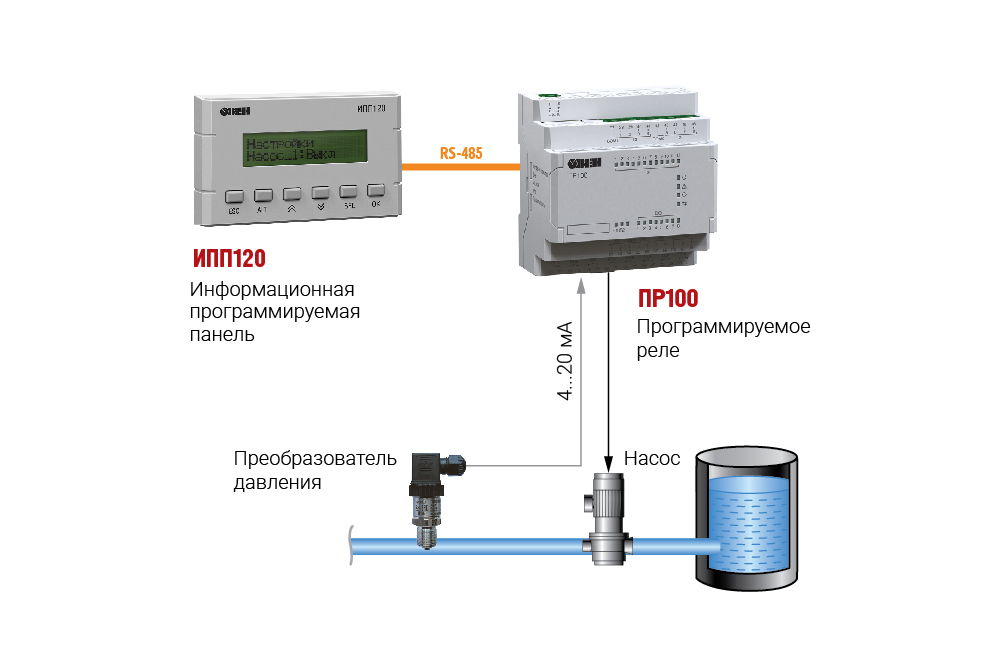 Работа по датчикам давления (4..20 мА) или сигнализаторам уровня.