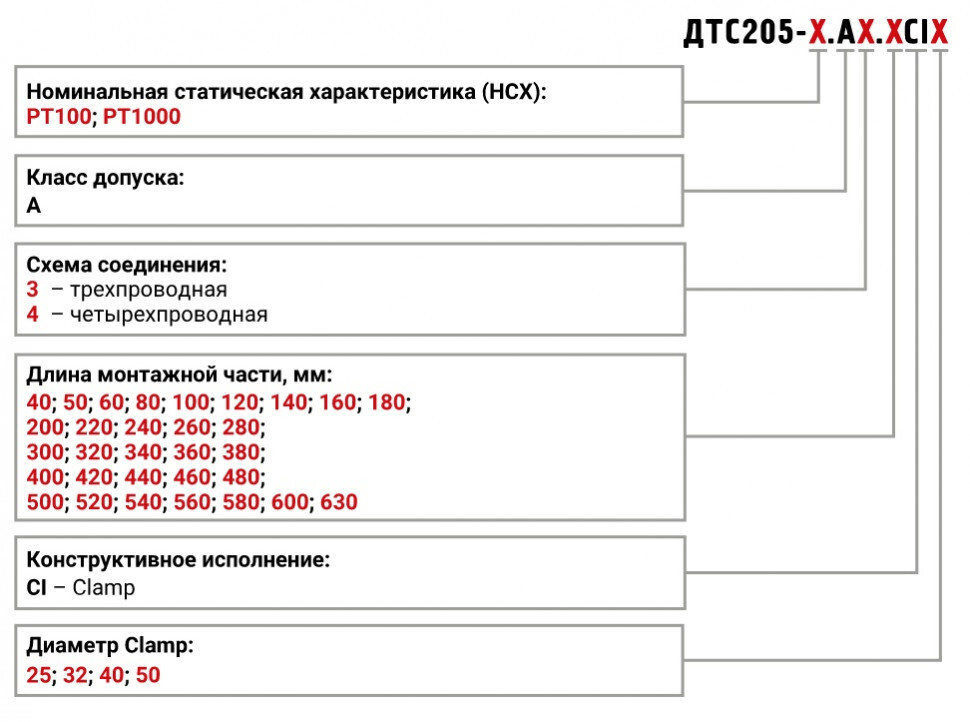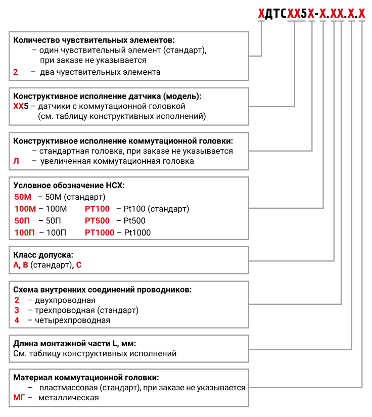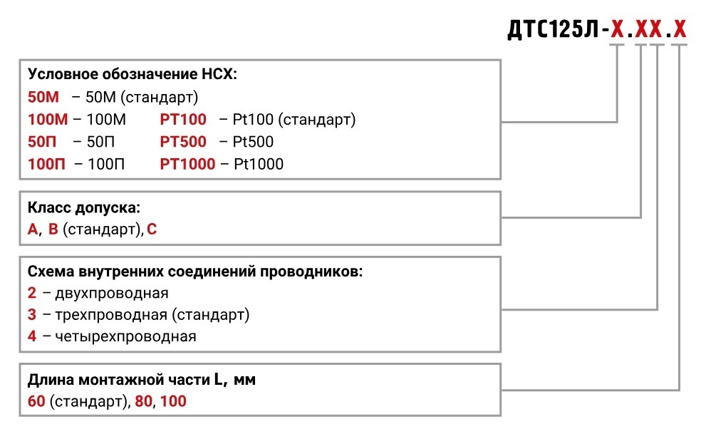 Пример обозначения при заказе: ДТС045-100М.В3.120.МГ Это означает, что к изготовлению и поставке подлежит термопреобразователь сопротивления медный 100М, модель 045, класс допуска В, с трехпроводной схемой соединений, длиной монтажной части 120 мм, с металлической коммутационной головкой, диапазон измерения: -50…+180 °С. Пример обозначения при заказе: ДТС125Л-100М.В3.80 Это означает, что к изготовлению и поставке подлежит термопреобразователь сопротивления медный 100М, модель 125Л, класс допуска В, с трехпроводной схемой соединений, длиной погружаемой части 80 мм, диапазон измерения: -60…+85 °С. Пример обозначения при заказе: ДТС065-РТ100.В3.120.G1/2 Это означает, что к изготовлению и поставке подлежит термопреобразователь сопротивления платиновый РТ100, модель 065, класс допуска В, с трехпроводной схемой соединений, длиной монтажной части 120 мм, с трубной резьбой G1/2, диапазон измерения: -50…+500 °С.