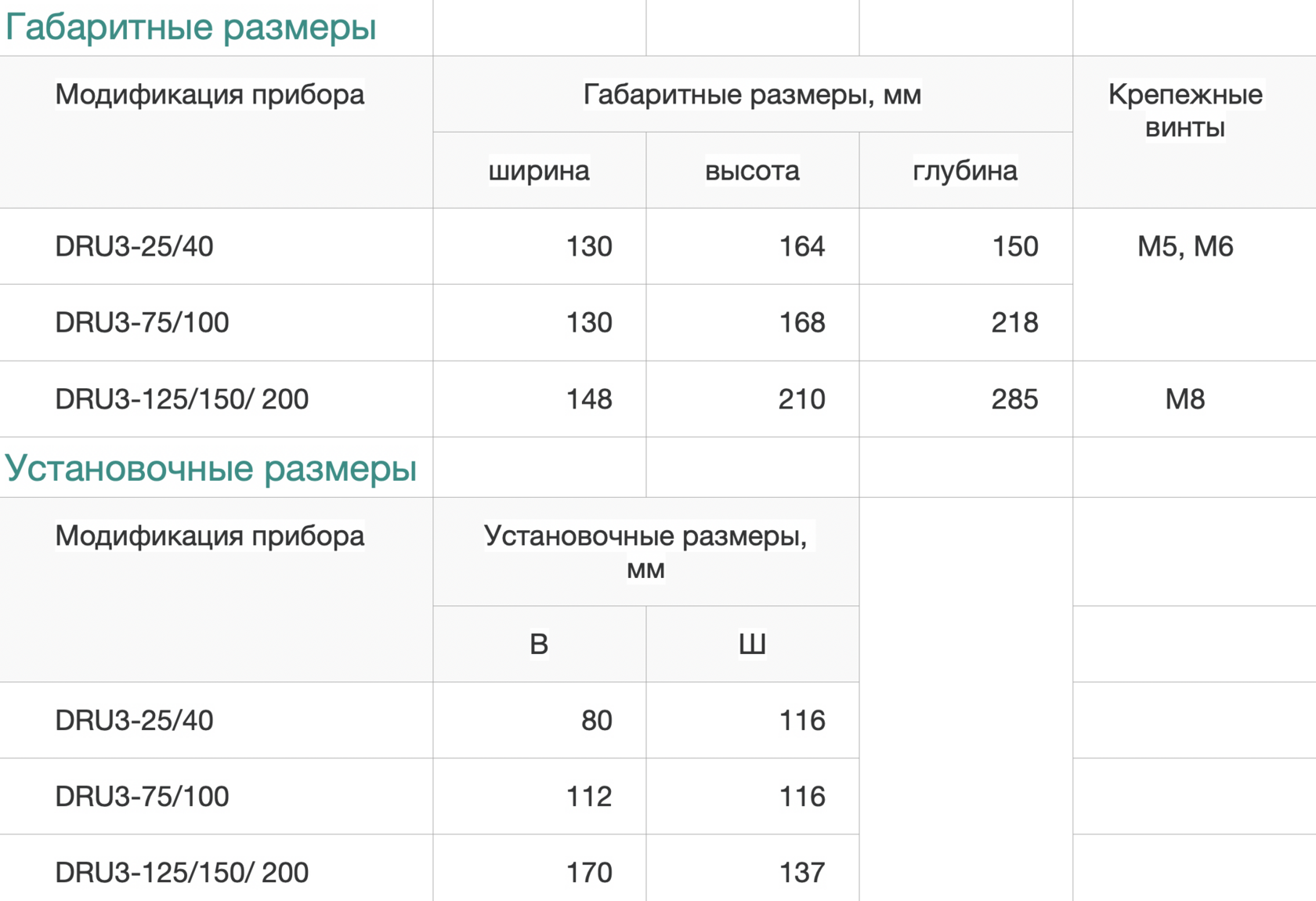 Гальваническая изоляция от сети 1500 В Дискретный вход Тип входа Логический Назначение Аварийный стоп Гальваническая изоляция от сети 1500 В Дискретный выход Тип выхода «Сухой контакт» Тип контактов: DRU3-25/40/75/100 Нормально-замкнутый DRU3-125/150/200 Перекидной Тип нагрузки Резистивная Максимальный коммутируемый ток 1 А Максимальное коммутируемое напряжение ~125 В, =30 В Гальваническая изоляция от сети 1500 В Силовой выход Тип нагрузки Активная (резистивная) Тип силовых ключей Тиристоры Номинальный выходной ток 16…125 А (зависит от модификации) Максимальный выходной ток (до 120 с) 25…200 А Схемы включения нагрузки «Звезда без нейтрали», «треугольник» Регулируемый параметр Мощность Способ регулировки выходного напряжения Фазовый Корпус Тип корпуса Для крепления на стену Степень защиты корпуса по ГОСТ 14254: - DRU3-25/40/75/100 IP20 - DRU3-125/150/200 IP00 Охлаждение: - DRU3-25 естественное - остальные модификации принудительное (есть встроенный вентилятор) Выделяемые тепловые потери 3,5 В × Ток нагрузки Масса устройства (брутто/нетто): - DRU3-25/40 2,20/2,35 кг - DRU3-75/100 2,75/2,96 кг - DRU3-125/150/200 6,10/6,97 кг Общее Средний срок службы 8 лет Гарантийный срок 12 месяцев