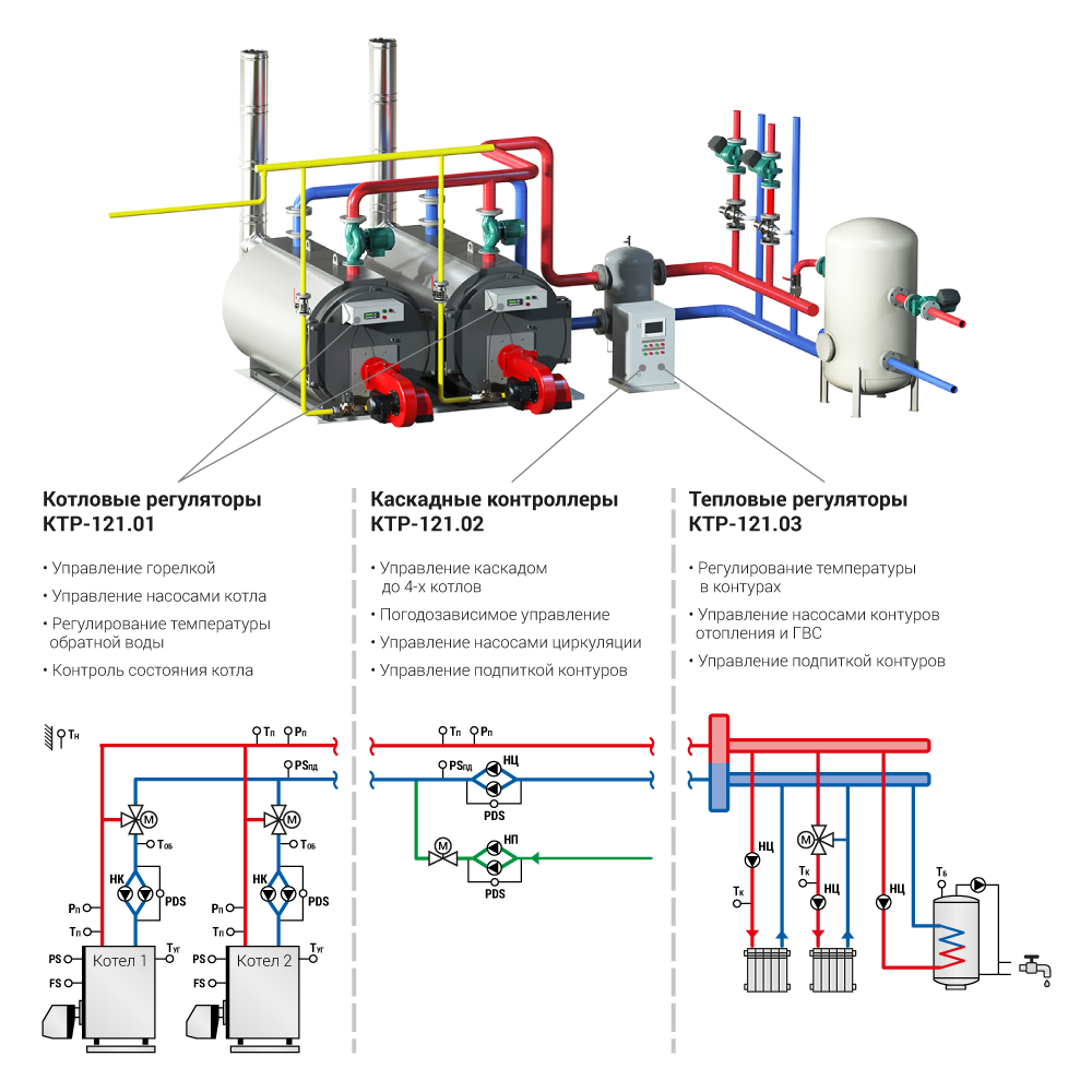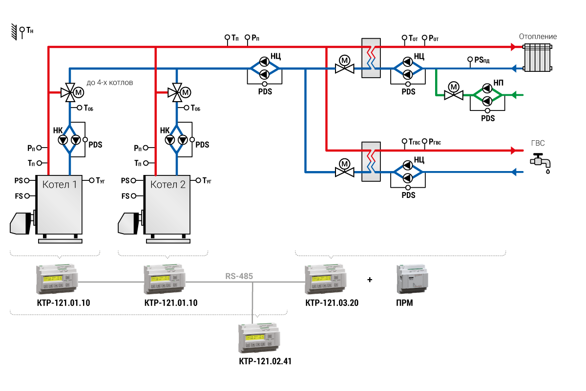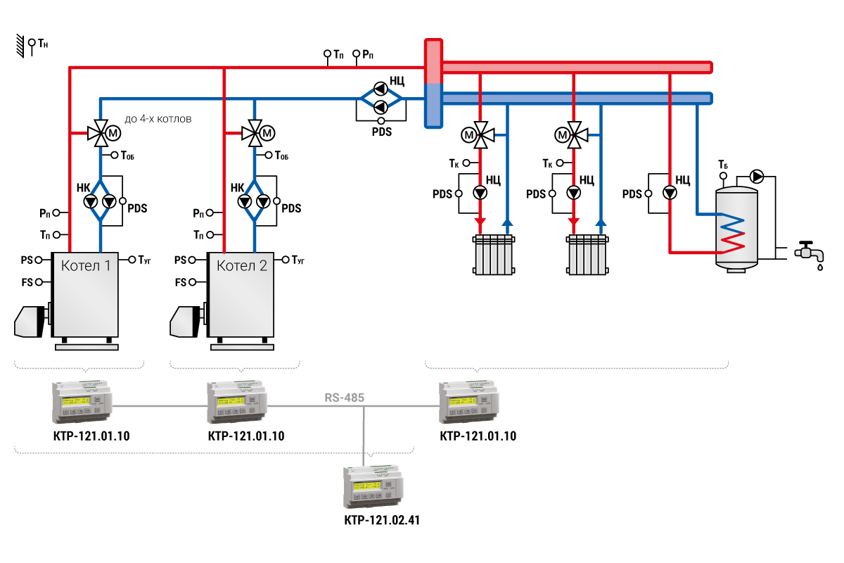 Объединяя различные алгоритмы КТР-121 в единую систему, можно получить решение для сложных схем котельных. Комбинации алгоритмов позволяют подобрать оптимальный набор автоматики для котельной.