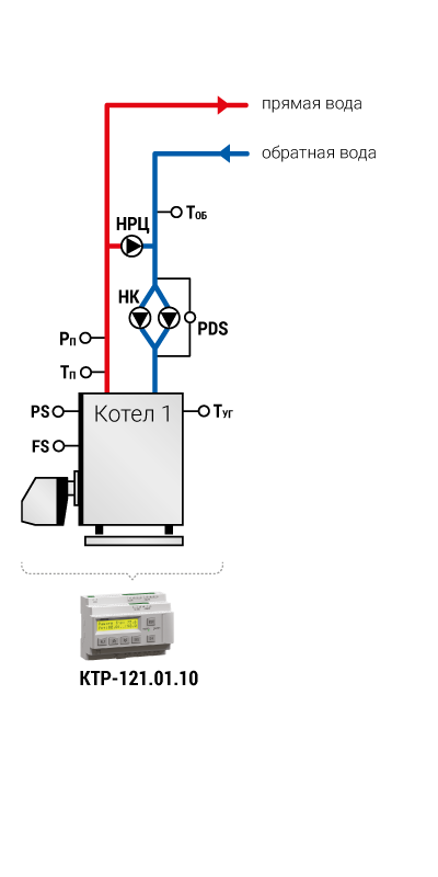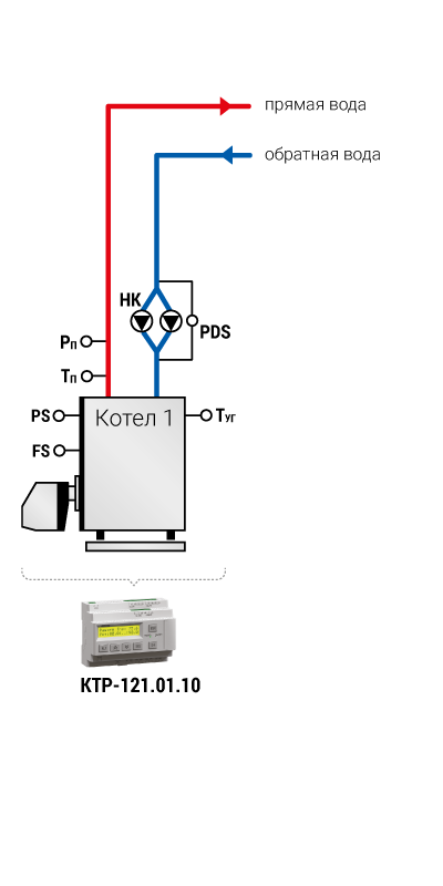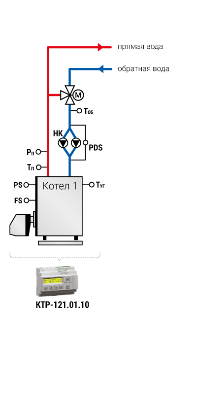 Тп – температура в подающем трубопроводе Тоб – температура в обратном трубопроводе Рп – давление в подающем трубопроводе PDS – реле перепада давления PS – реле давления FS – реле протока НК – насос котловой НРЦ – насос рециркуляции М – клапан регулирующий с электроприводом