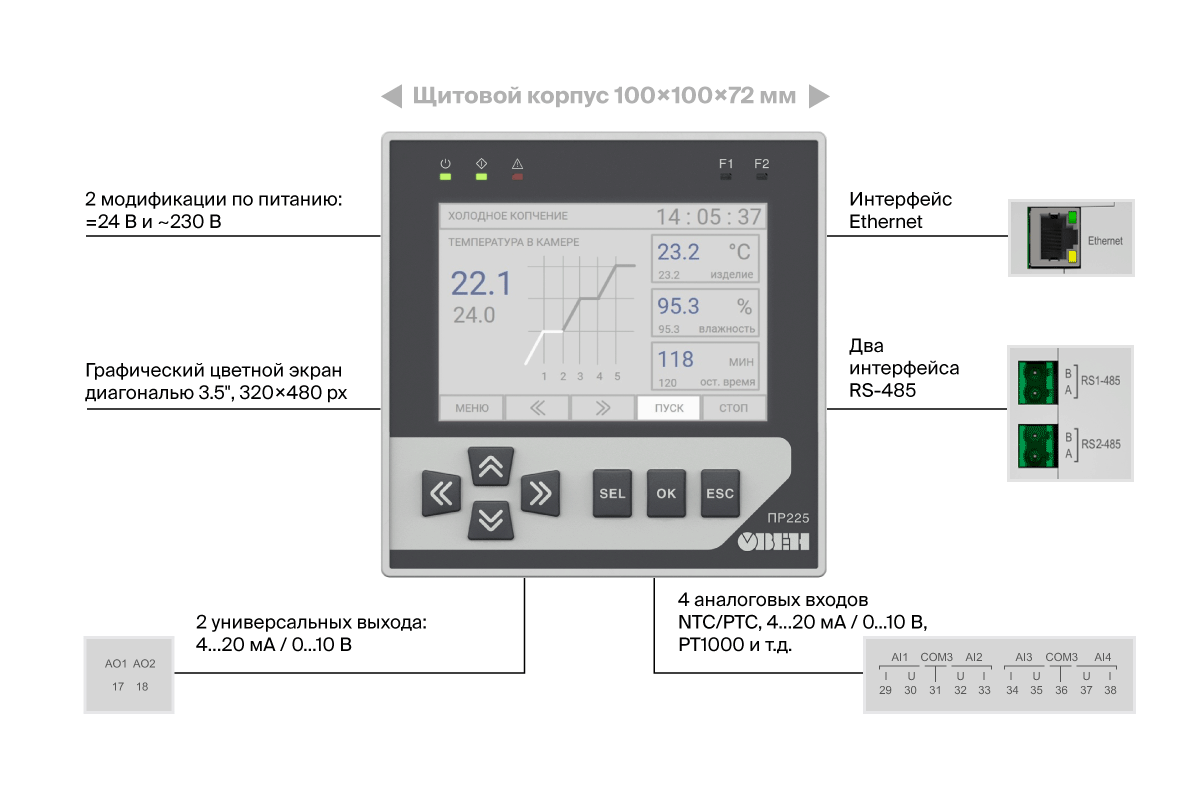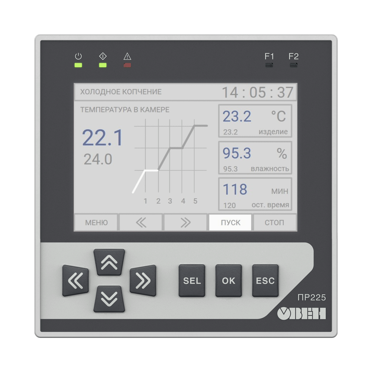 ПР225 – новое программируемое реле в щитовом корпусе с графическим дисплеем и Ethernet. Прибор сочетает в себе оптимальную конфигурацию аналоговых и дискретных входов-выходов для управления в системах водоснабжения, отопления, кондиционирования, вентиляции, пищевой промышленности и др. Графический цветной экран 3,5” позволяет создавать удобные и наглядные интерфейсы пользователей, что значительно упрощает настройку и восприятие информации. А крепление прибора на дверцу шкафа не требует использования панели оператора. Интерфейс Ethernet позволяет интегрировать прибор в распределенные системы, увеличивать количество входов-выходов с помощью модулей ввода-вывода Мх210, удаленно контролировать и управлять оборудованием с помощью облачного сервиса OwenCloud. В зависимости от модификации у ПР225 предусмотрено до 2-х интерфейсов RS-485. Это позволяет расширить систему с помощью модулей Мх110 для управления исполнительными механизмами или передачи данных на верхний уровень. Алгоритм работы ПР225 строится пользователем в бесплатной нативной российской среде программирования Owen Logic. Это позволяет создавать уникальные пользовательские алгоритмы и учитывать все особенности системы.
