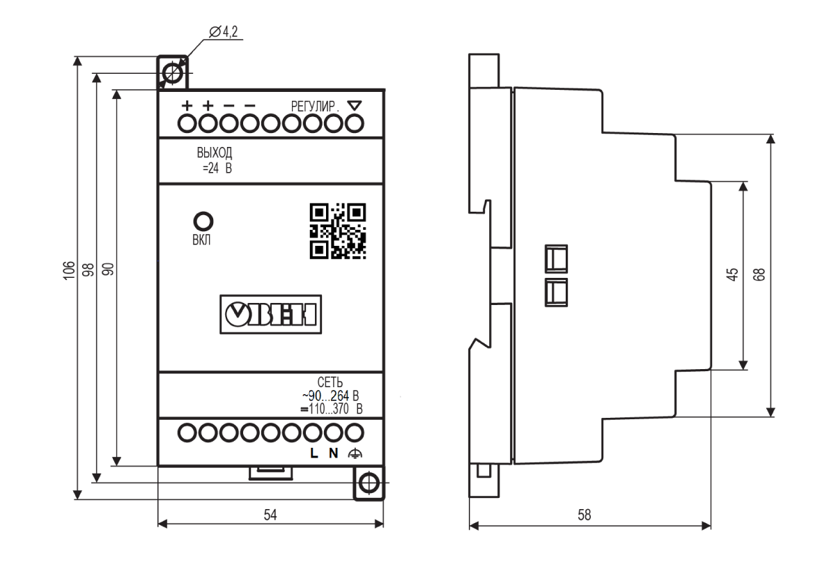 Регулировка выходного напряжения с помощью внутреннего подстроечного резистора в диапазоне ±8 % от номинального выходного напряжения с сохранением мощности.
