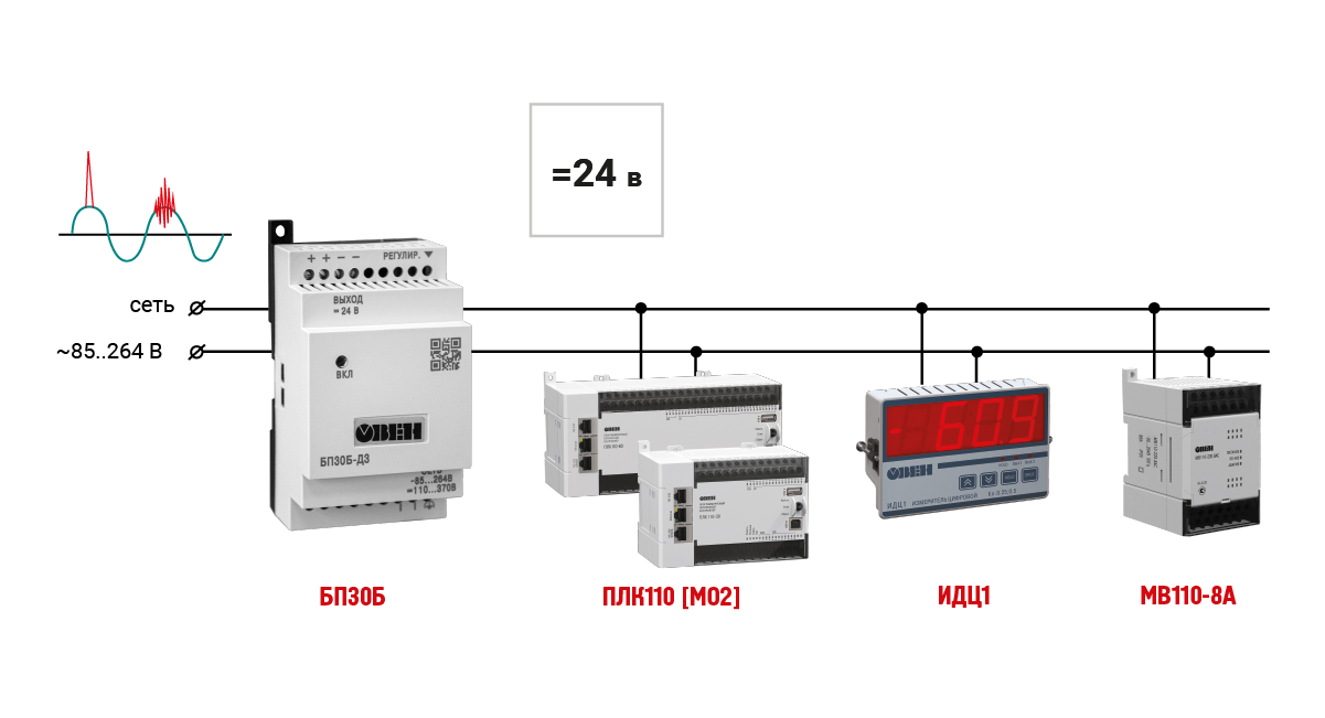 Уверенный запуск нагрузки с большими входными емкостями (панели оператора, модемы и т.п.).