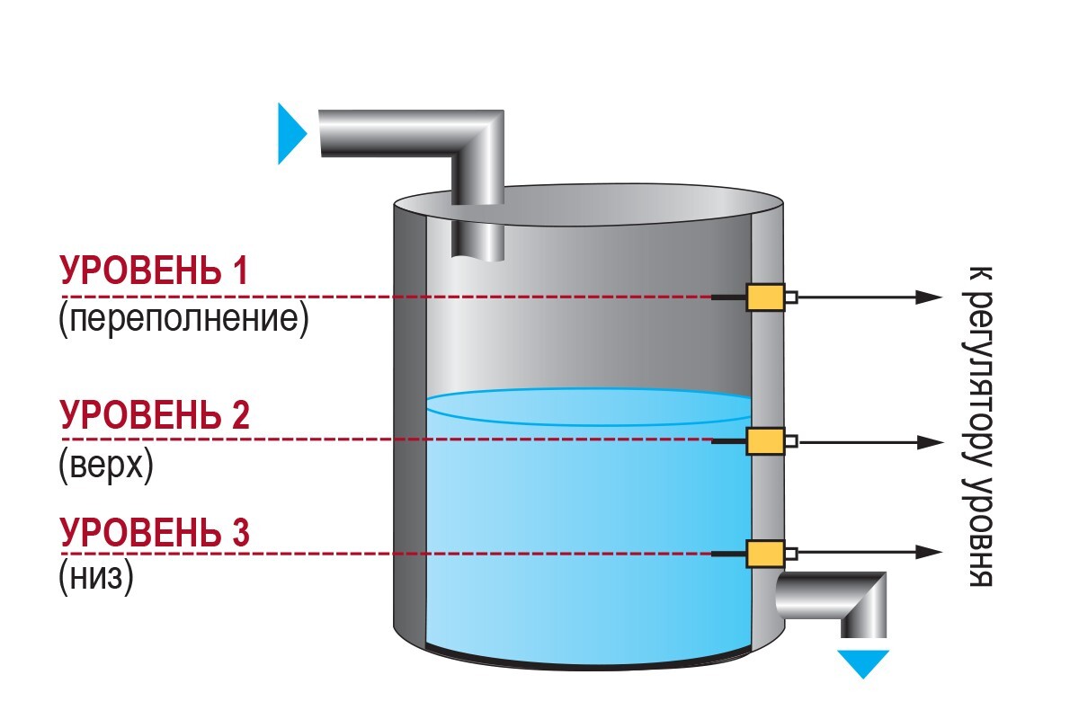 Принцип действия кондуктометрического датчика основан на разнице между электропроводностью воздуха и жидкости. Эта разница фиксируется двумя электродами: сигнальным, установленным на необходимом уровне, и общим. Когда поверхность жидкости соприкасается с сигнальным электродом, происходит замыкание между двумя электродами. Кондуктометрические датчики применяются для измерения уровня как в металлических, так и неметаллических резервуарах. В металлических резервуарах количество применяемых для измерения сигнальных электродов соответствует числу измеряемых уровней, а общим электродом служит стенка резервуара. В этом случае потребителю следует приобрести один или несколько датчиков (в зависимости от количества сигнализируемых уровней) с электродами соответствующей длины. В неметаллических резервуарах количество используемых датчиков должно быть на один больше, чем число сигнализируемых уровней, поскольку один из них служит в качестве общего электрода. Его длина должна быть максимальной по отношению к длине электродов других датчиков.