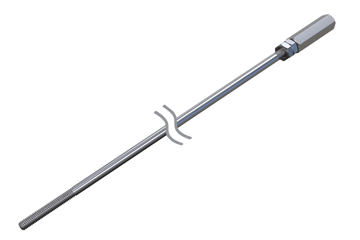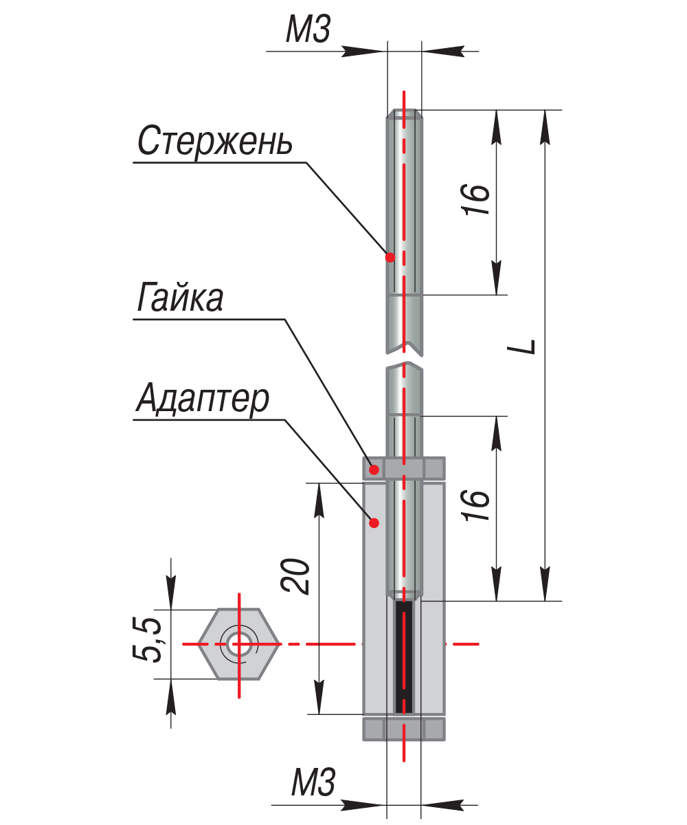 Стержень Стержень с адаптером Стержни выпускаются в исполнениях: 0,15 / 0,25 / 0,5 / 1 / 1,95 / 1,95 с адаптером / 2,5 / 3 / 3,5 / 4 м. Стержень с адаптером позволяет увеличивать длину электродов. Фиксированная длина стержня - 1,95 м. Благодаря адаптеру можно наращивать длину электрода датчика до 10 м. Разборная конструкция электрода обеспечивает удобство транспортировки. Материал электродов – сталь нержавеющая 12Х18Н10Т или AISI 304. Стержни не входят в комплект поставки датчика, они заказываются отдельно. При заказе стержня с адаптером в комплект входит: электрод длиной 1,95 м с резьбой с двух сторон, адаптер, две гайки.