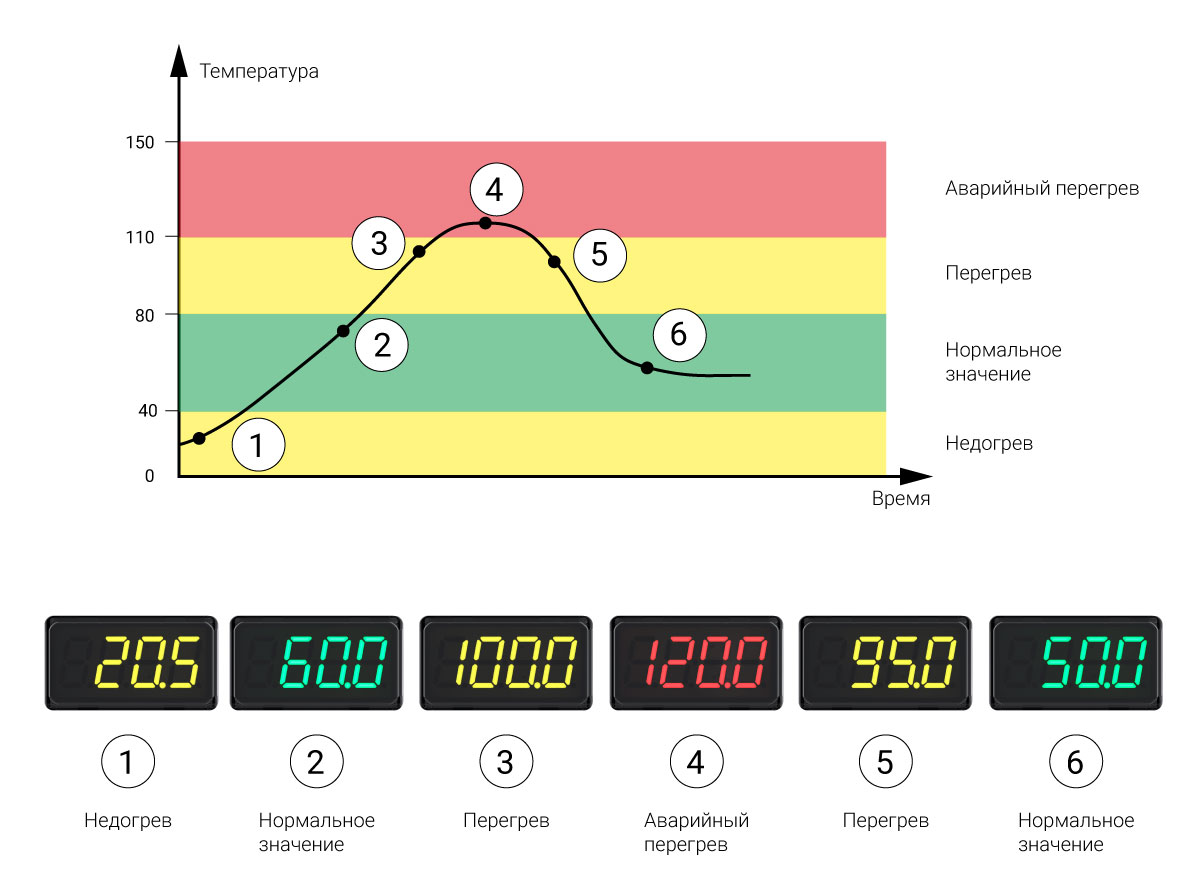 Пользователь самостоятельно задаёт пороги переключения для каждого диапазона: например, от 0 до 50 °C – недогрев, от 50 до 90 °C – нормальное значение и так далее. Можно задать любые границы зон и соответствующие им цвета внутри диапазона измерения. Главное – значения каждой следующей границы должны быть больше предыдущей.